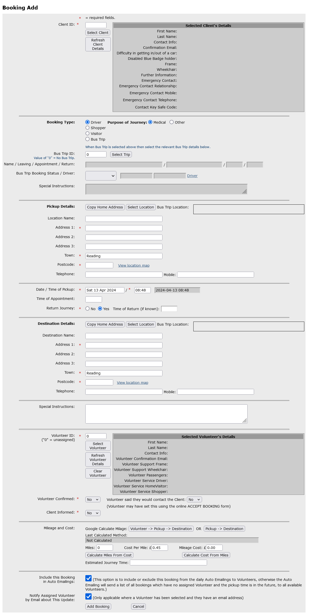 Confirmation details are sent to Volunteers together with directions Google map links. Clients, Volunteers and commonly used destinations in a Locations table can be added and selected for bookings at the click of a button. Emails are sent out daily to volunteers telling them how many available unassigned bookings are available and they can accept them themselves, saving the office workers a lot of time.