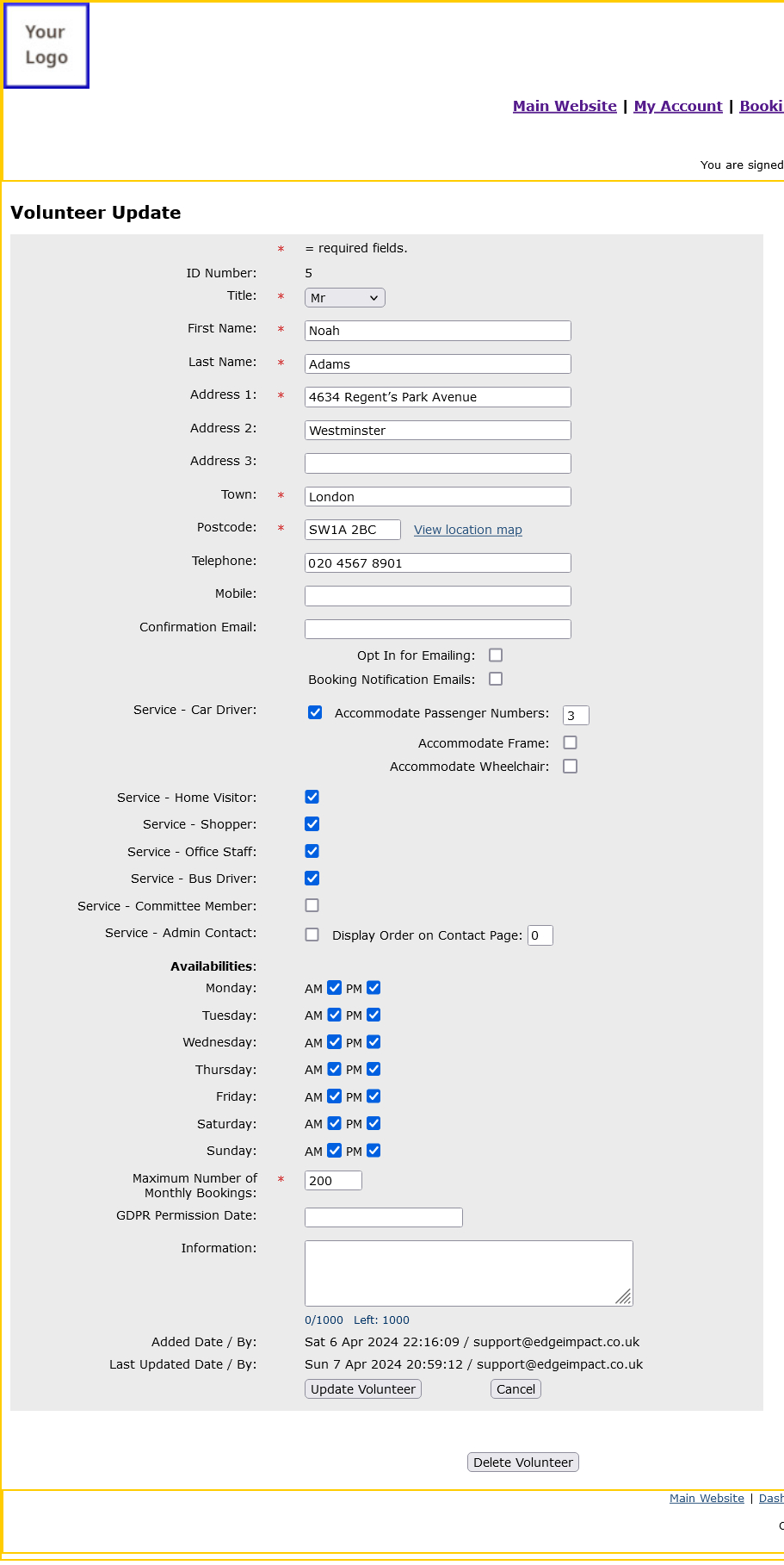 Volunteer records allow you to specify the days and times that they are available, the type of bookings that they can fulfil plus other important criteria associated with their availability.