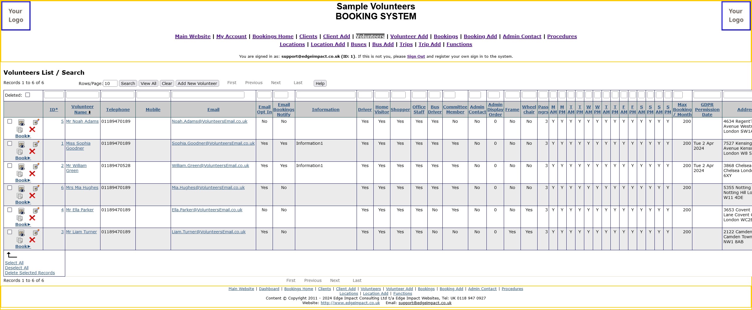The Volunteers List section. Here you will see a list of all of your volunteers. The list can be searched, sorted by heading and new volunteers can be added, whilst existing volunteers' details can be edited or deleted. There is no limit to the number of volunteers' records that you can enter.